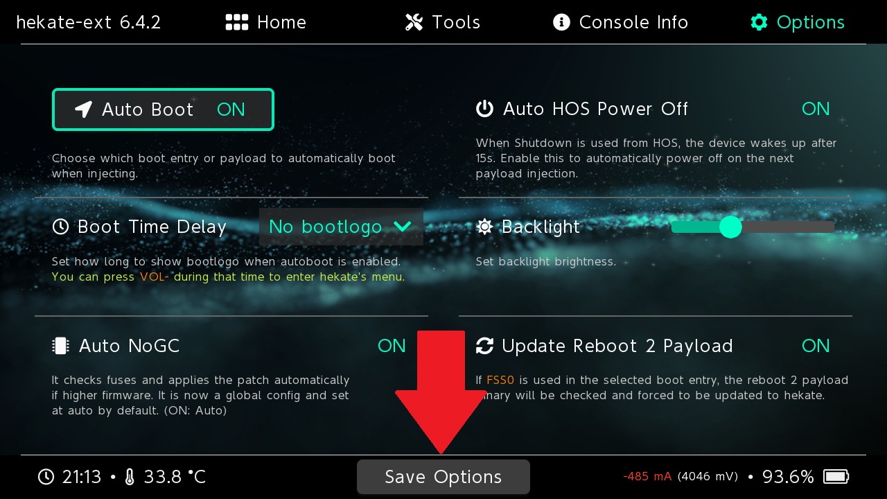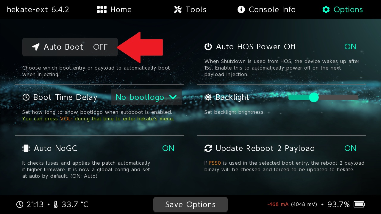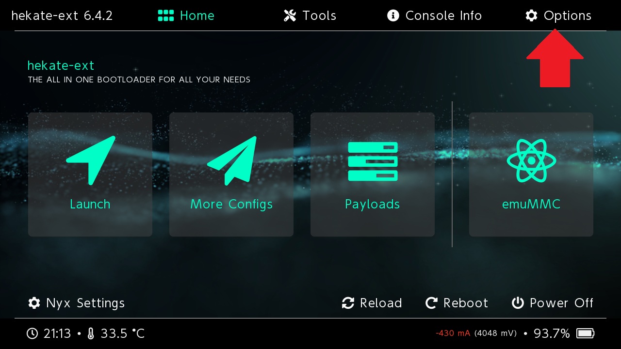 Ez nagyon egyszerű. Mikor bekapcsol a gép és bejön a HEKATE menü, válaszd az OPTIONS menüpontot a jobb felső sarokban.