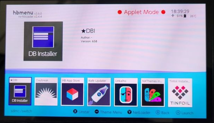(Ha nincs rajta akkor töltsd le a legújabbat INNEN és másold a dbi.nro fájlt az SD kártya sdmc:/switch/ mappába)